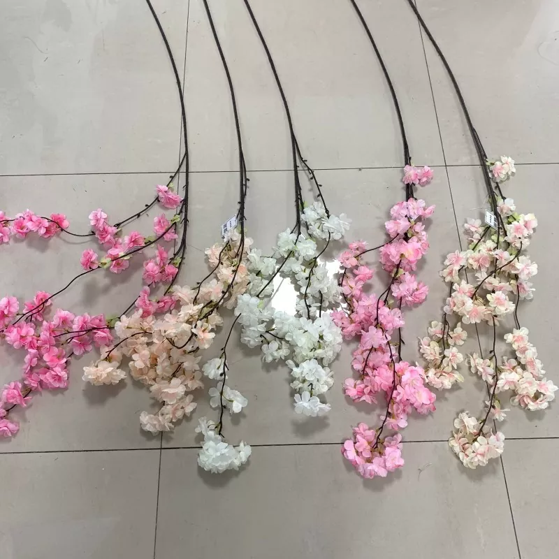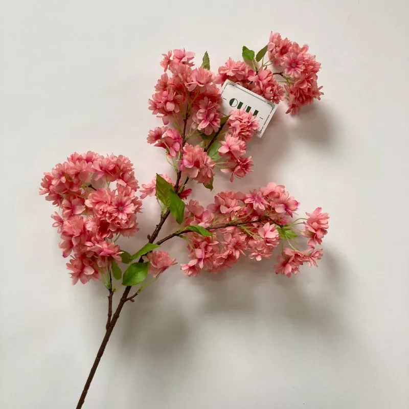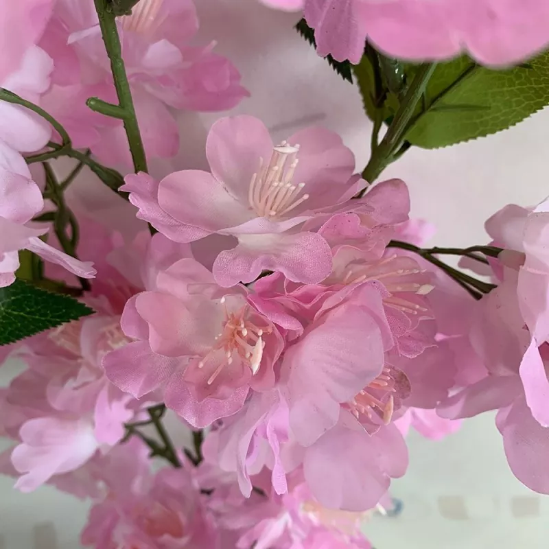 De kunstige kirsebærblomstgrener har tre lag silkeblade, lyserøde stamens, fem-forgrenede grene og fire sæt grønne blade. Stående ca. 63 cm (ca. 2 tommer) høj, er den velegnet til forskellige indstillinger, herunder boligindretning og bryllupsarrangementer.